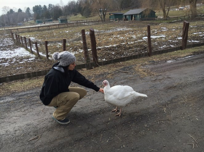 We ended up at the beautiful Catskill Animal Sanctuary which is home to hundreds of rescued farm animals. Those lucky enough to have escaped the short tortured lives in factory farms but some not lucky enough to have escaped the array of medical issues caused by the industry. I discovered CAS almost a year ago and have been obsessed with the place since. I typically will visit, take a tour, walk through seeing the animals but this time we were going to volunteer and help. We booked a night at the Homestead, their B&B on the property, and headed up. We spent the day cleaning out the bird houses. We took out the old bedding and put in new. We did this 8 times, loading and unloading the truck with new and old hay- and we laughed the whole time. Michael, the rescued turkey, followed us the entire day keeping us company. When we had to move the truck I would run far far away from the truck and call his name and Michael would come running over. At only a few months old his body is already growing too fast and heavy for him, but he’s managing.